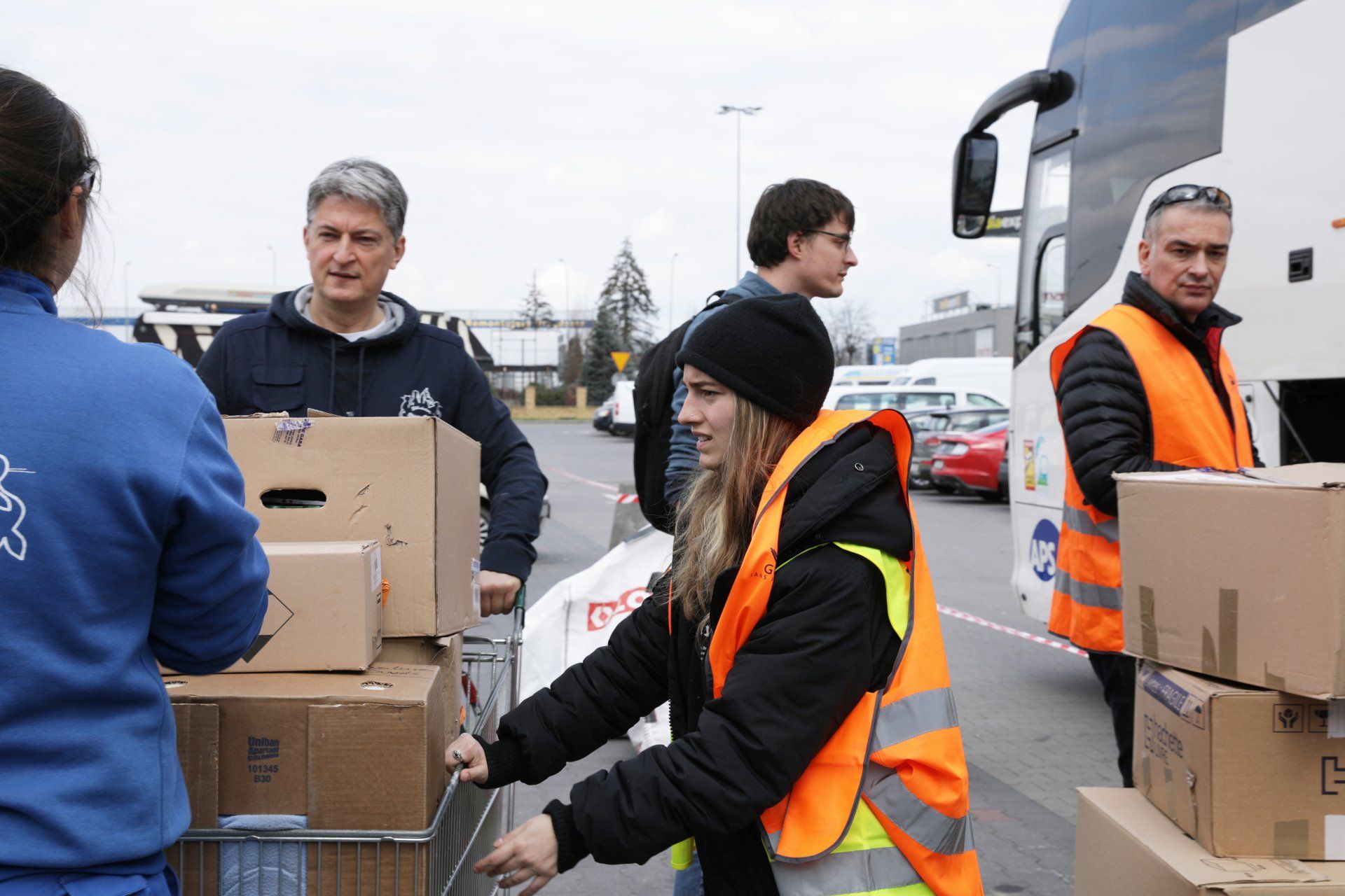 Les quatre chauffeurs se sont relayés toute la nuit pour conduire et c'est donc sur les coups de midi qu'ils arrivent à Tesco (Przemysl). Là-bas, ils retrouvent Juliette et Elisa qui préparent ce gros départ depuis des jours... Oui, oui, tous ces convois en simultané. Rappelons que l'un d'eux est certes sur le chemin du retour, mais pas encore arrivé à destination.
